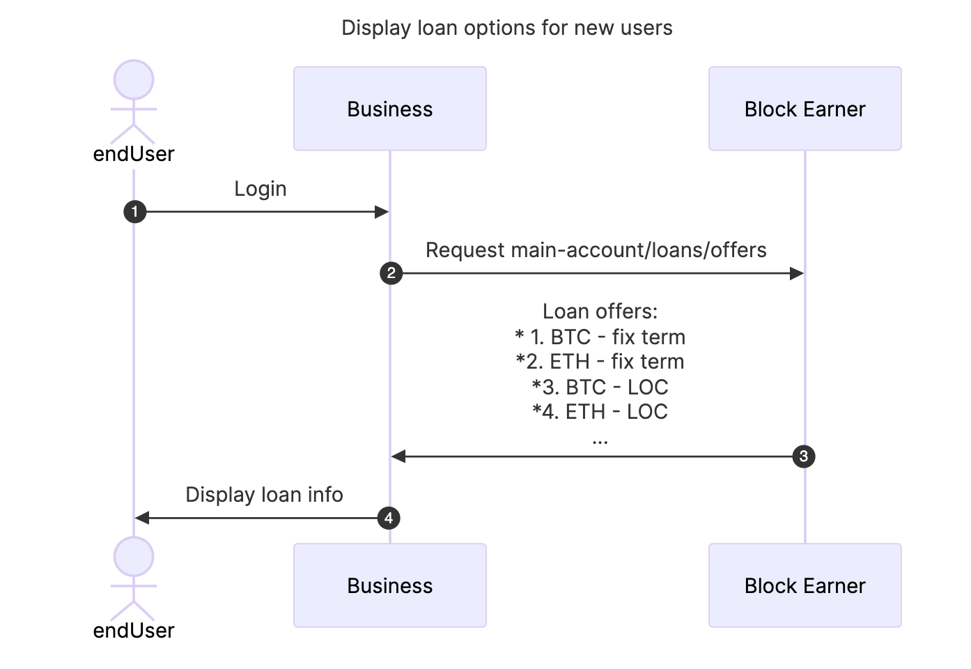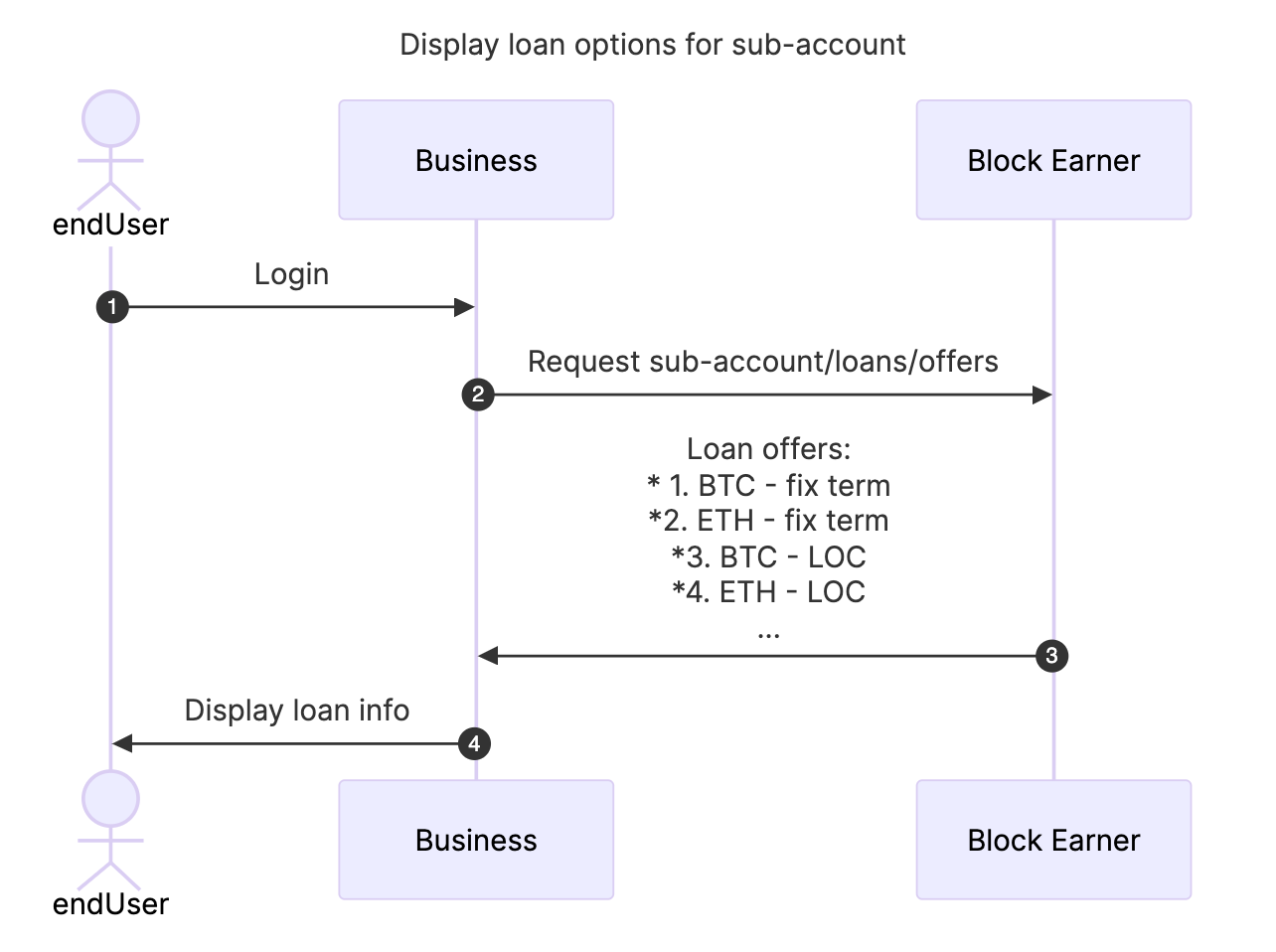 After sub-account creation, use Get loan offers for sub-account API to request the loan offers for the sub-account. Block Earner recommends to create a sub-account for an end-user when the user first shows interest to the loan application, or when you'd like to setup a bespoke loan offer for a customer.