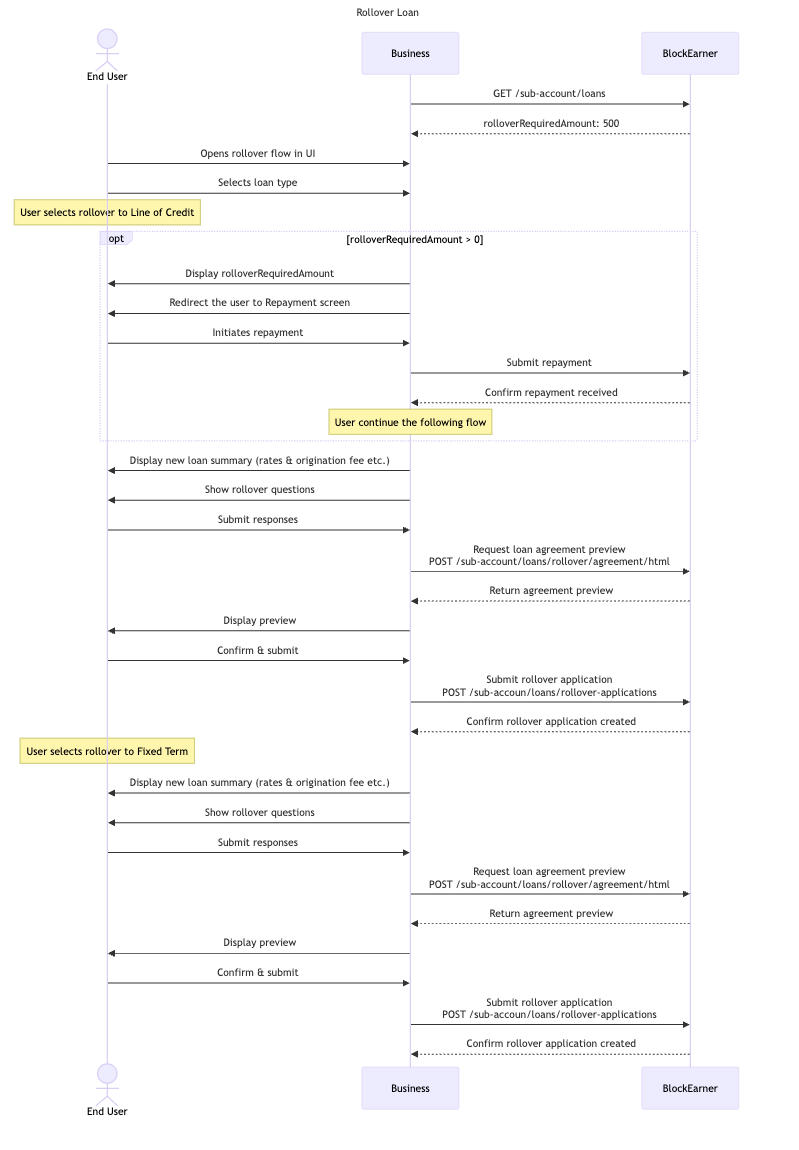 Rollover is a loan management action that enables users to extend the term of an existing loan. It is only applicable to Line of Credit loans. A user can either: